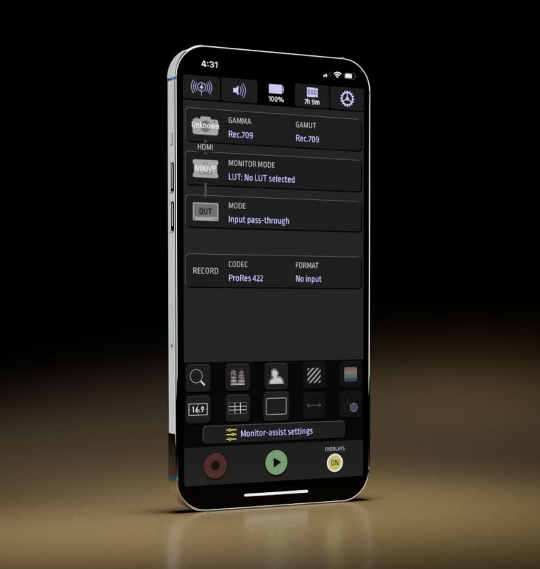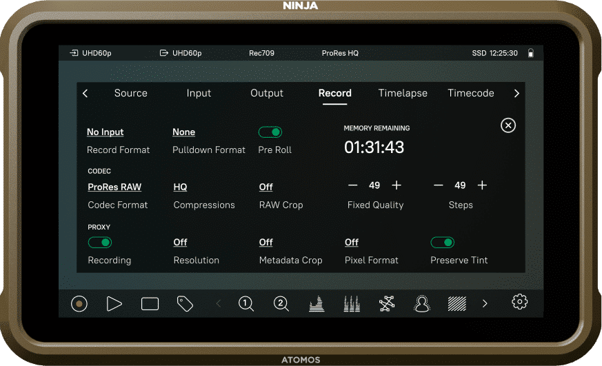 The AtomRemote app for iOS and macOS has an array of controls for Ninja via Atomos Connect. It lets you configure and control your Ninja from up to 15 meters away via Bluetooth LE while you define camera connections, select Gamma/EOTF and adjust Gamut settings. AtomRemote can control playback, select monitoring modes, apply custom 3D LUTs, and view image analysis tools, including exposure and focus. Output controls include options for 4K to HD, LUT preview and HDR output.