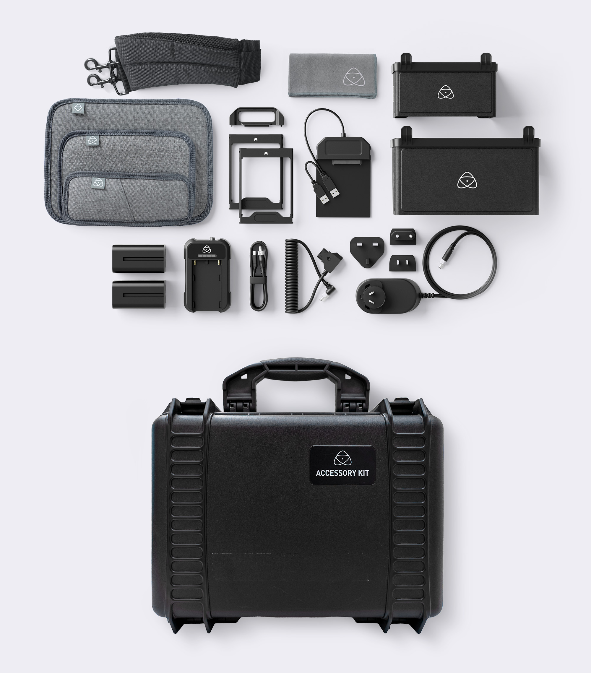 Multiple power options, SSD accessories, 5- and 7-inch sunhoods, all in a versatile hard case for Atomos 5-inch and 7-inch monitor/monitor-recorders: Shogun Connect / Shogun 7 / Ninja / Ninja Ultra / Ninja V / Ninja V+ / Shinobi