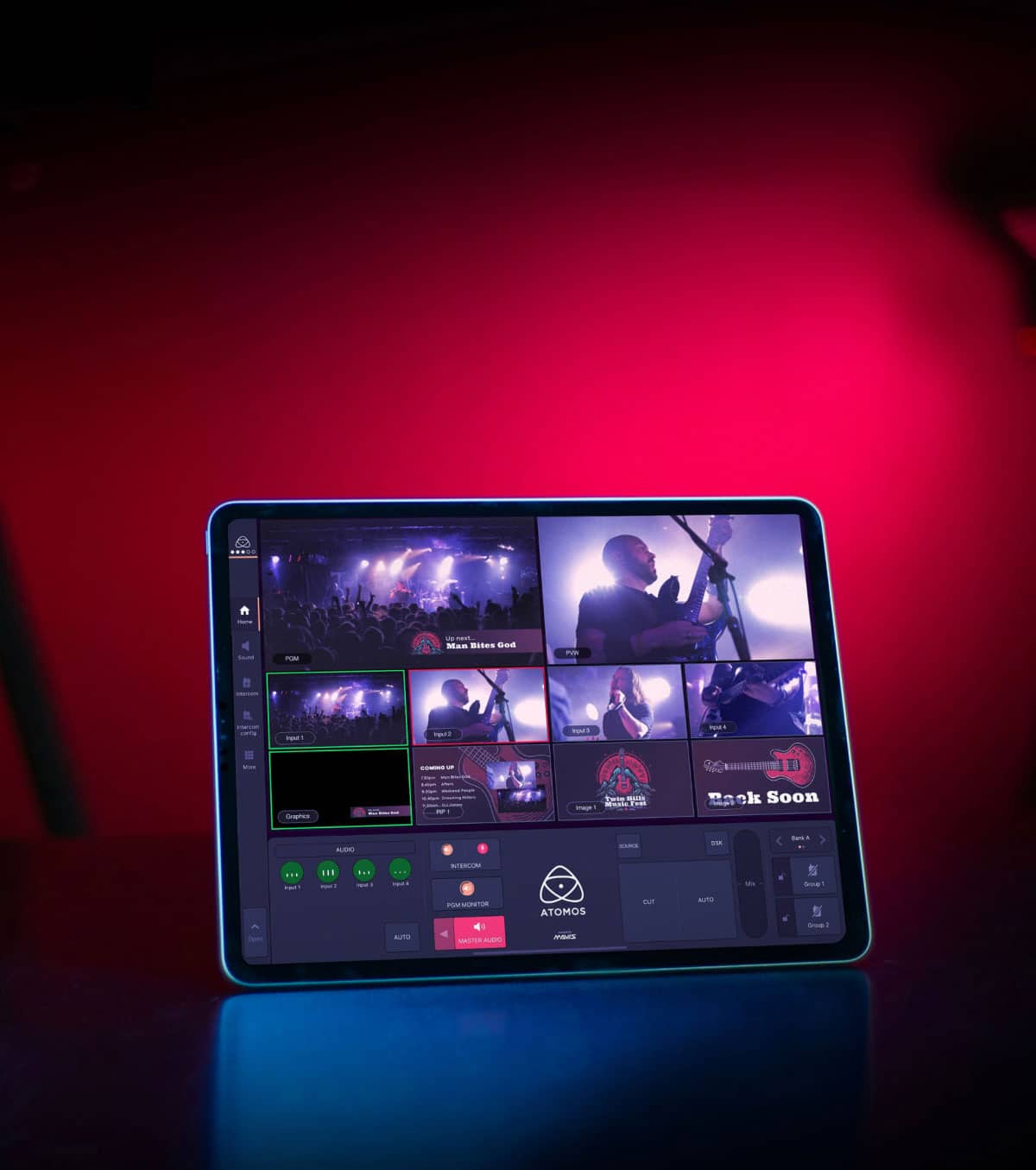 The Atomos – Surface app for iPad features all the tools running in the cloud that you need to create a polished live production. Features include a video switcher for up to 8 inputs, a sound mixer for up to 32 channels, 2 x VT Players, 8 x DVE, 8 x frame players, transitions, HTML5 graphics, still images, PiPs and a fully integrated global talkback/intercom system, available as an iOS app called Atomos – Surface and directly on the Atomos device.